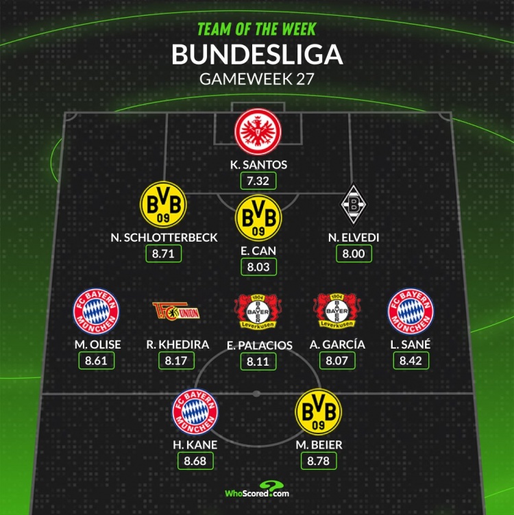 3月31日訊 德甲第27輪比賽戰(zhàn)罷,WhoScored根據(jù)球員評分列出了本輪最佳陣容,凱恩、薩內(nèi)、奧利塞在列。