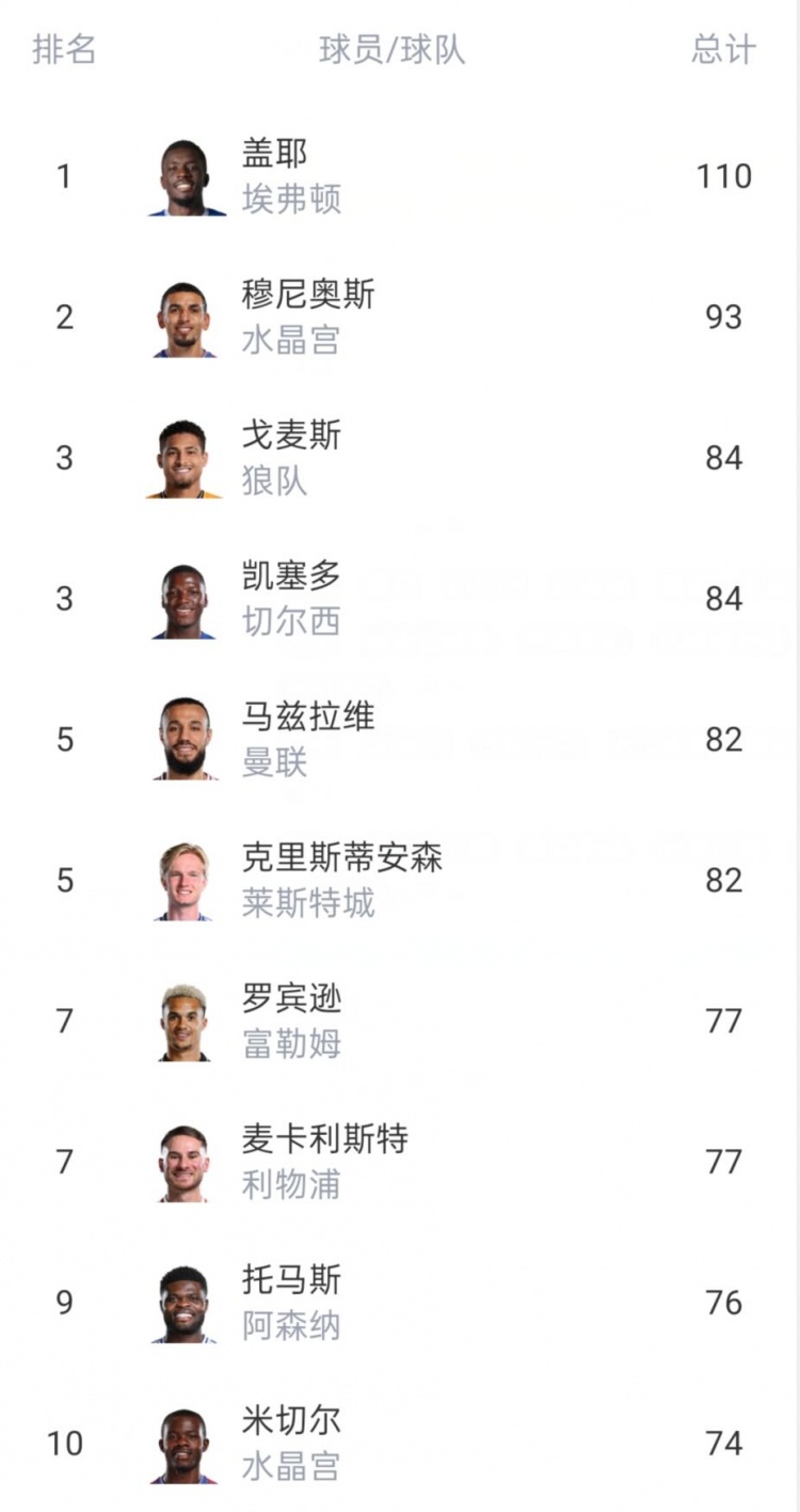 110次!埃弗頓中場蓋耶是本賽季英超唯一搶斷次數超100的球員
