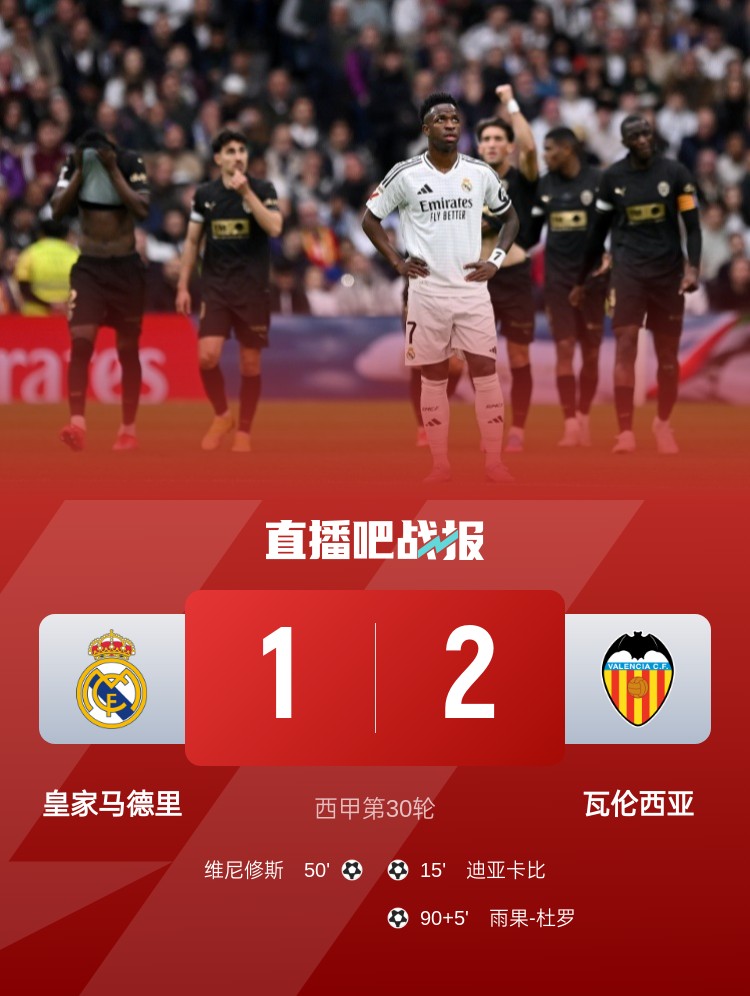 西甲第30輪,皇馬1-2瓦倫西亞,聯賽三連勝終結。上半場,姆巴佩造點,維尼修斯罰丟,迪亞卡比頭球破門;下半場,貝林厄姆助攻維尼修斯扳平,瑪瑪達什維利神撲,雨果-杜羅補時絕殺。