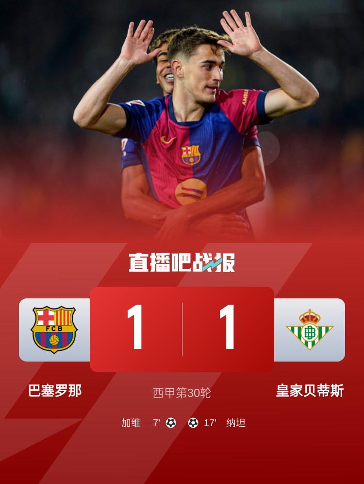 西甲第30輪,巴薩1-1貝蒂斯,聯賽九連勝終結。上半場,費蘭-托雷斯助攻加維破門,納坦扳平;下半場,兩隊均未改寫比分。