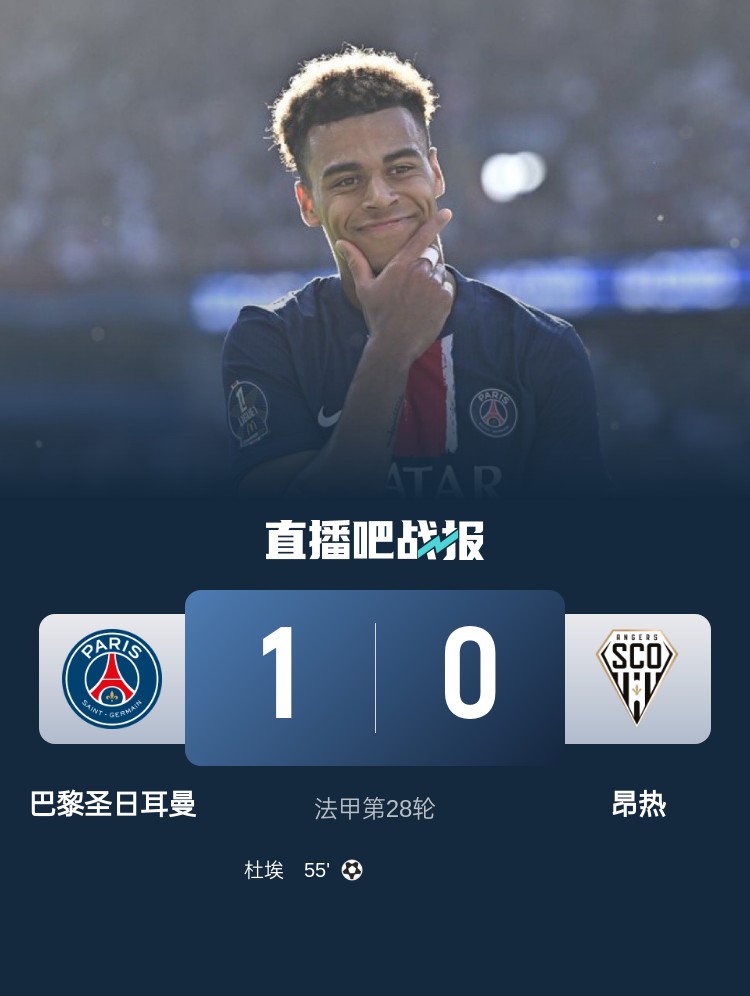 法甲第28輪,巴黎圣日耳曼主場1-0擊敗昂熱,提前6輪鎖定冠軍。上半場,帕喬破壞單刀,維蒂尼亞遠射造險;下半場,克瓦拉茨赫利亞助攻杜埃搶點破門。