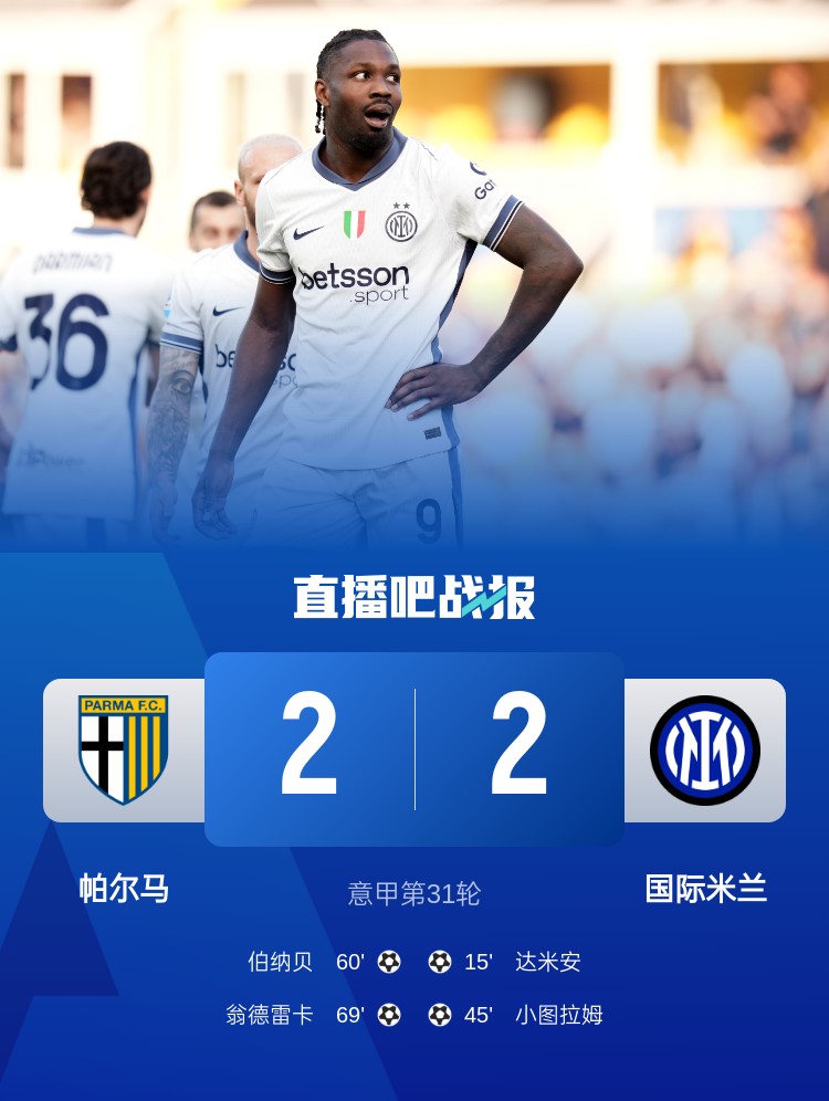 意甲第31輪,國米客場2-2帕爾馬。上半場,達米安勁射破門,小圖拉姆搶點建功;下半場,伯納貝遠射扳回一城,翁德雷卡抽射變線入網扳平。
