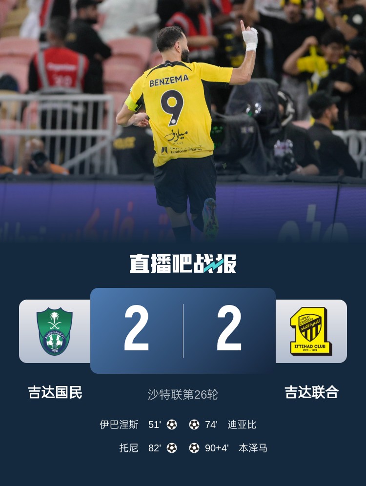 沙特聯第26輪,吉達聯合2-2吉達國民仍5分領跑。上半場,馬赫雷斯遠射造險,托尼禁區被薩德放倒裁判沒表示,吉達聯合0射正;下半場,坎特失空門,伊巴涅斯頭球破僵,迪亞比推射破門扳平,坎特烏龍助攻托尼抽射反超,本澤馬補時絕平。