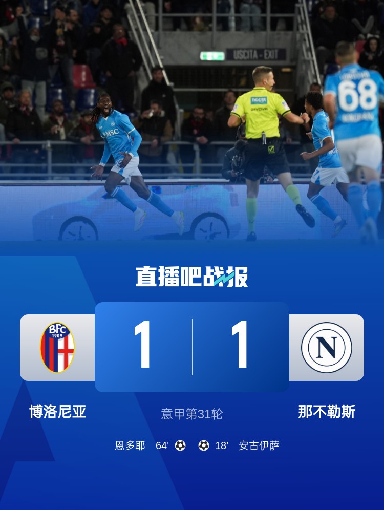 那不勒斯1-1戰平博洛尼亞,落后榜首國米3分。