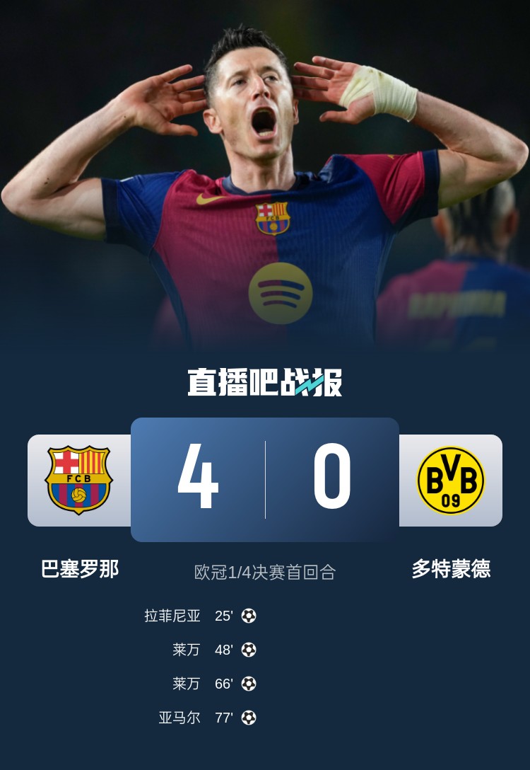 歐冠8強(qiáng)首回合,巴薩4-0大勝多特!萊萬(wàn)雙響,亞馬爾、拉菲尼亞破門(mén)!懸念已無(wú)了嗎?