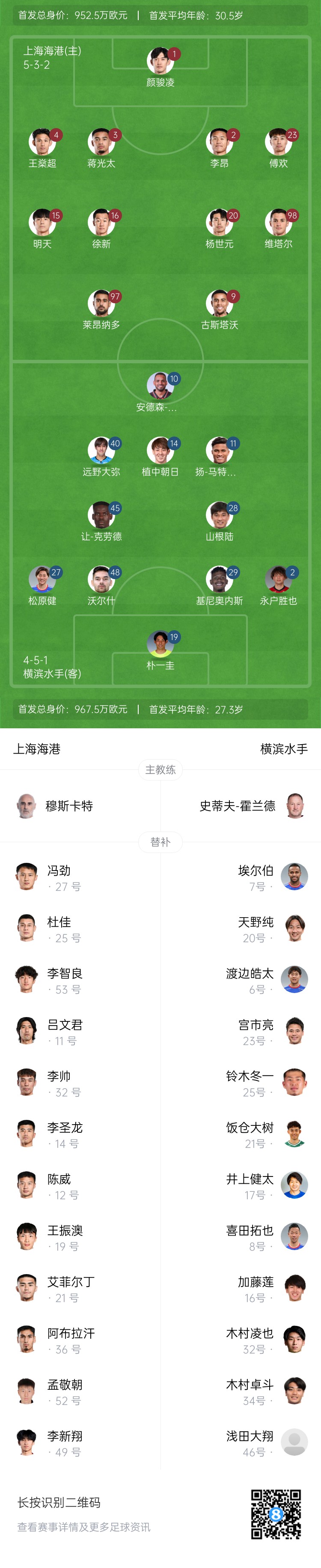 上海海港替補(bǔ):25-杜佳、53-李智良、11-呂文君、12-陳威、14-李圣龍、19-王振澳、21-艾菲爾丁、27-馮勁、32-李帥、36-阿布拉汗、49-李新翔、52-孟敬朝