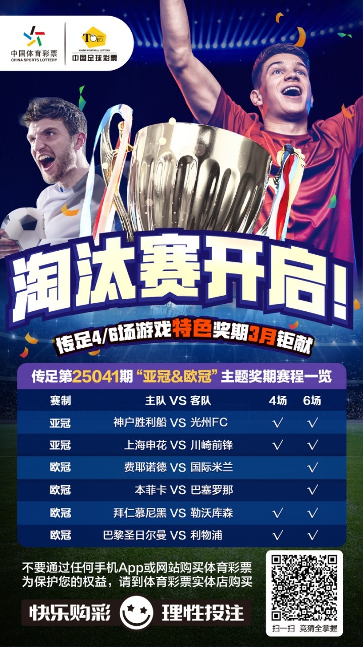 時至三月,亞冠和歐冠淘汰賽鳴鑼開打,大戰(zhàn)正式開啟。傳足4/6場游戲特色獎期第25041期競猜對陣為:亞冠方面神戶勝利船VS光州FC、上海申花VS川崎前鋒;歐冠方面費耶諾德VS國際米蘭、本菲卡VS巴塞羅那、拜仁慕尼黑VS勒沃庫森、巴黎圣日爾曼VS利物浦。
