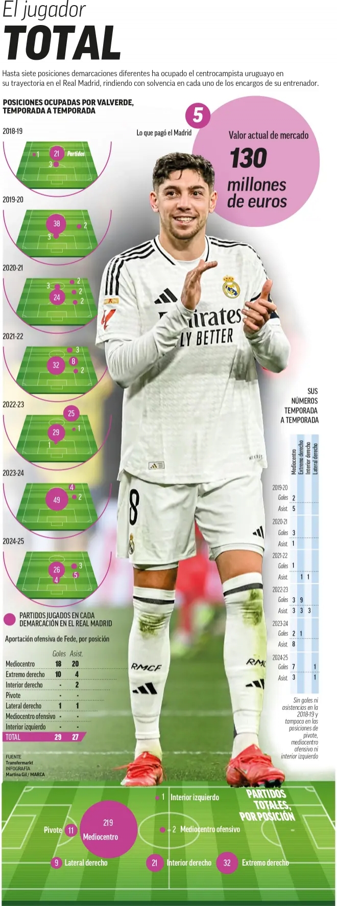 巴爾韋德的主業(yè)則是中場,500萬歐轉(zhuǎn)會費買下的他,如今身價1.3億歐。而實際上,身兼多職的他毫無疑問是無價的:邊中場,居中,前腰,后腰……師從克羅斯的巴爾韋德,總共擔任過7個不同的位置。