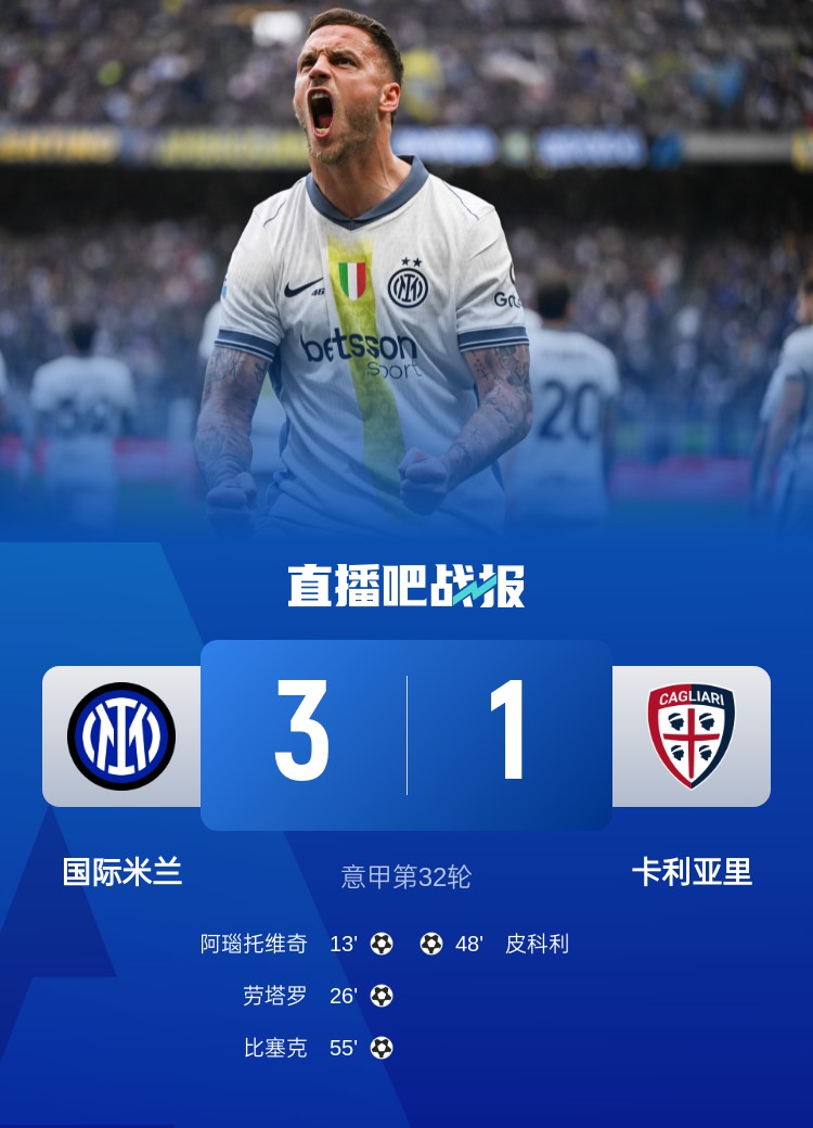 意甲第32輪,國(guó)米3-1卡利亞里,阿瑙托維奇?zhèn)魃洌瑒谒_進(jìn)球。