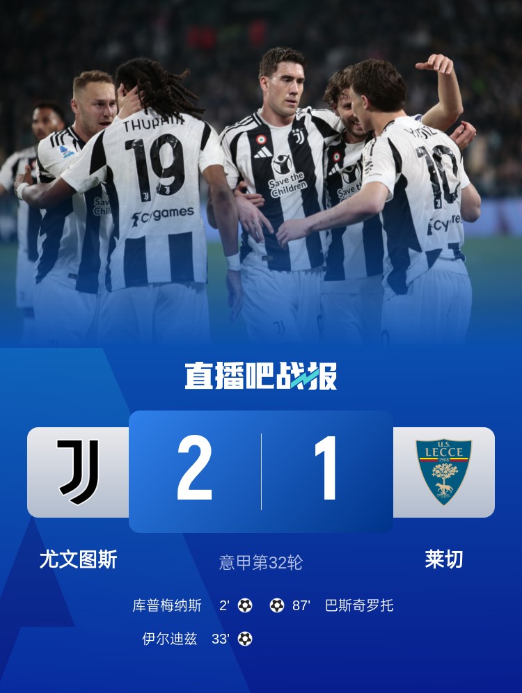 意甲第32輪,尤文圖斯2-1萊切,庫(kù)普梅納斯、伊爾迪茲進(jìn)球,弗拉霍維奇兩次助攻。