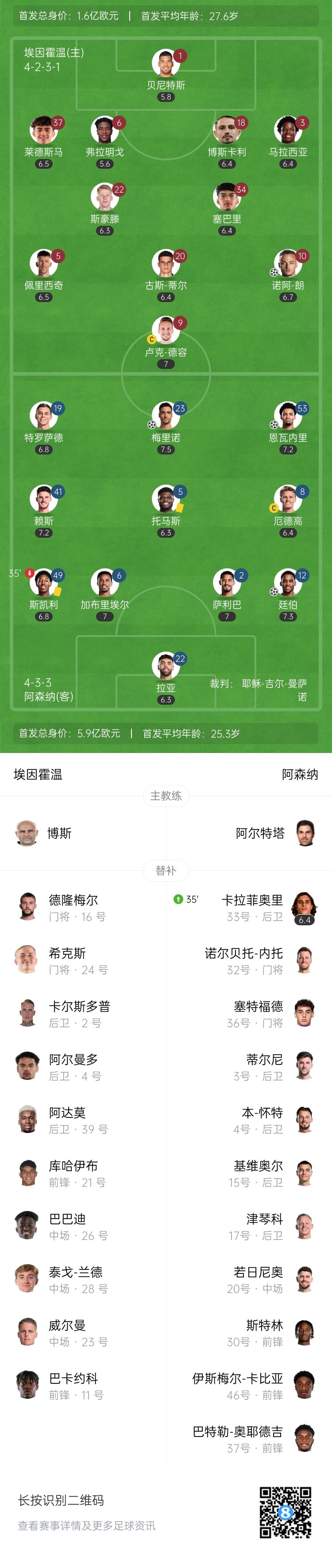 3月5日訊 北京時間4:00,歐冠1/8決賽首回合阿森納客場挑戰埃因霍溫,比賽在飛利浦大球場打響!上半場,廷伯頭球破門首開記錄,恩瓦內里抽射建功;斯凱利染黃;隨后梅里諾再下一城!托馬斯送點,諾阿-朗點射扳回一球。半場結束,阿森納暫時3-1領先埃因霍溫。