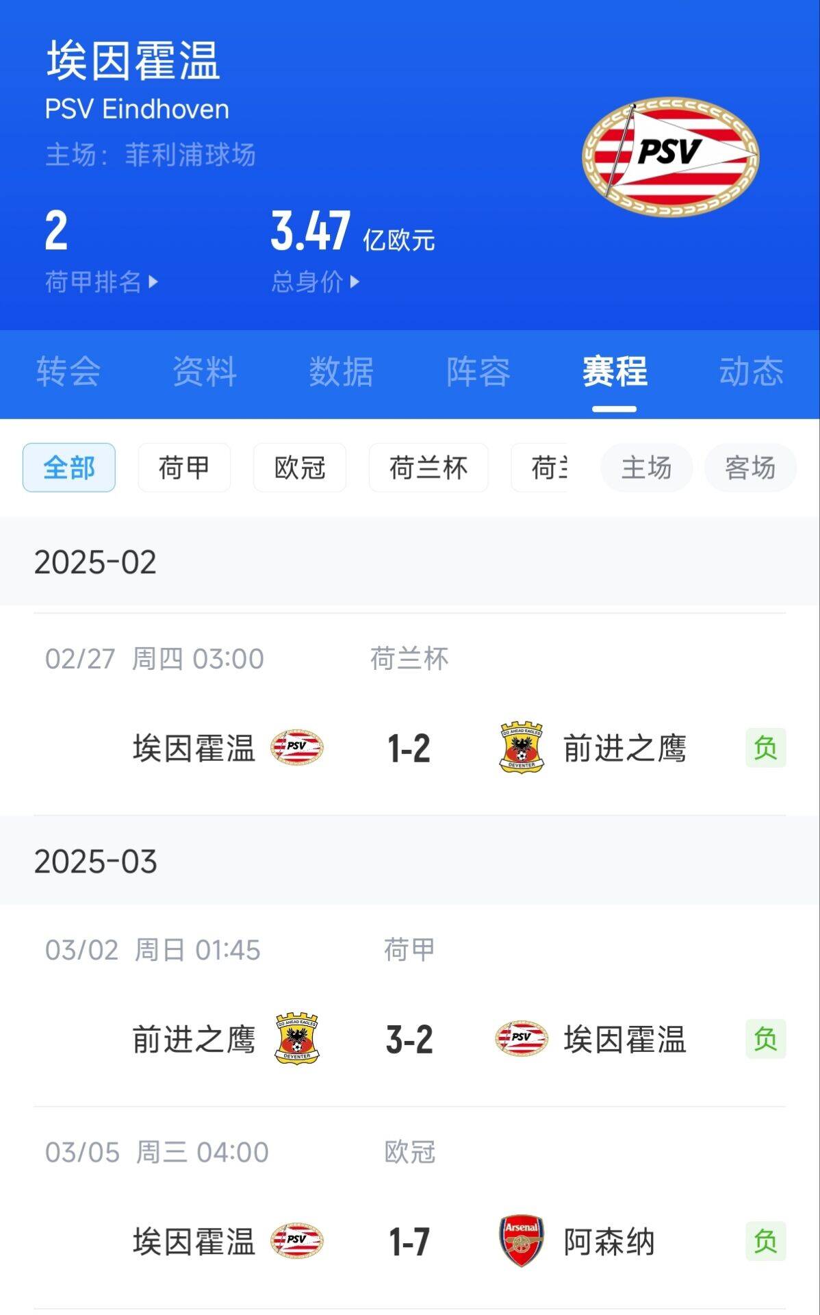 6天前的2月27日,埃因霍溫荷蘭杯半決賽1-2不敵前進之鷹,無緣決賽。3天前的荷甲聯賽,埃因霍溫2-3被前進之鷹雙殺,荷甲再丟3分,距離榜首阿賈克斯已有8分差距。今天凌晨,埃因霍溫歐冠遭遇慘敗,出局幾乎板上釘釘。