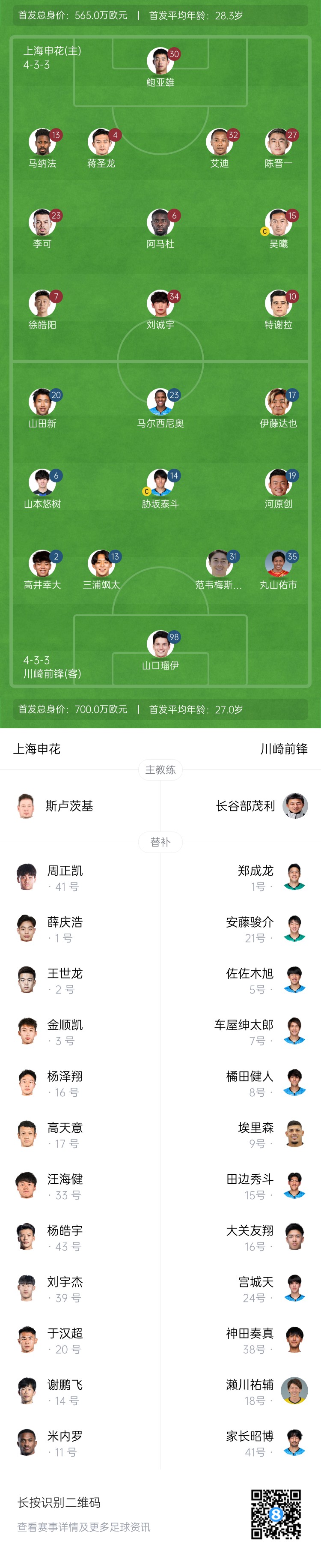 上海申花首發:30-鮑亞雄、4-蔣圣龍、13-馬納法(F)、27-陳晉一、32-艾迪、6-阿馬杜(F)、7-徐皓陽、15-吳曦、23-李可、10-特謝拉(F)、34-劉誠宇