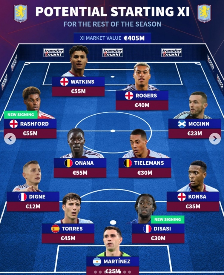 德轉預測維拉下半程首發陣:總身價4.05億歐
