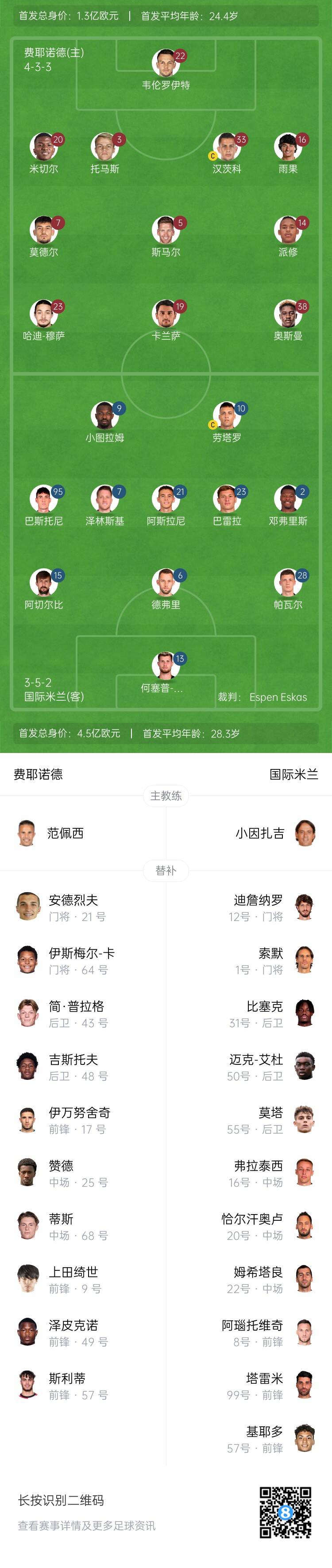 3月6日訊 歐冠1/8決賽首回合,國米客場對陣費(fèi)耶諾德。賽前,官方公布了本場的首發(fā)名單。