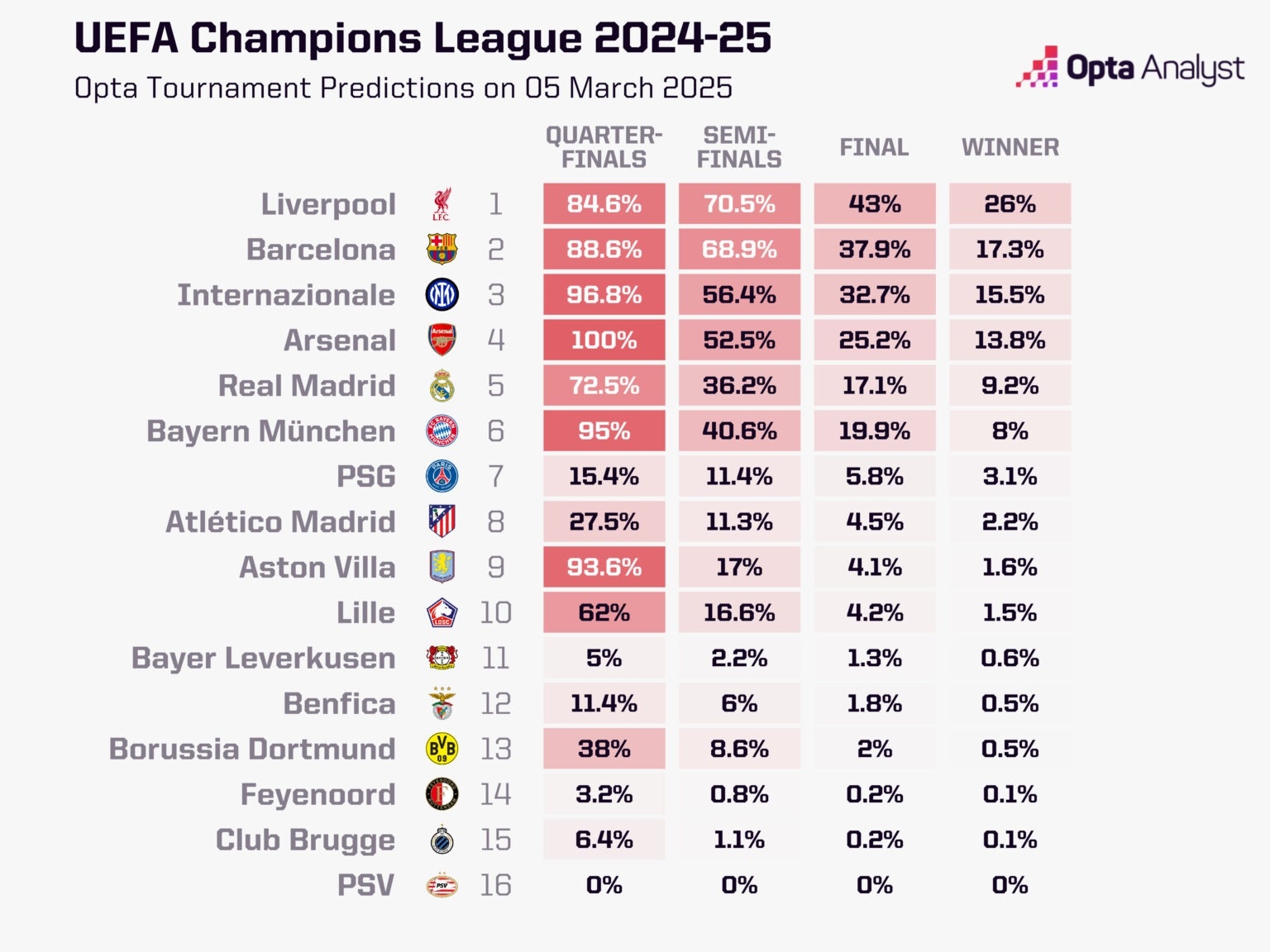 此外,Opta還計算了各支球隊晉級歐冠四強、決賽以及歐冠奪冠的概率。