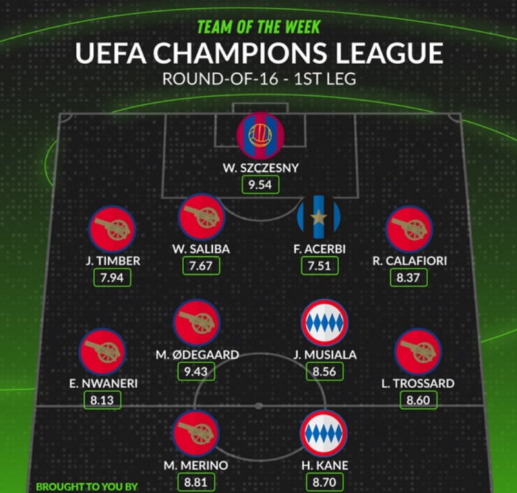 Whoscored評本輪歐冠最佳陣:厄德高領(lǐng)銜阿森納7人入選,凱恩在列?