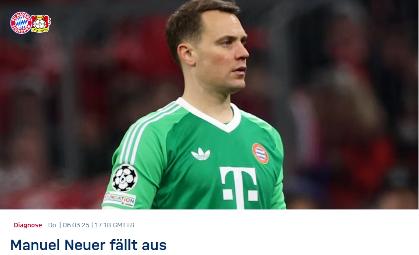 據(jù)德媒報(bào)道,諾伊爾將缺席3-4場比賽。這也意味著諾伊爾將無緣對陣?yán)瘴謳焐臍W冠1/8決賽次回合比賽。
