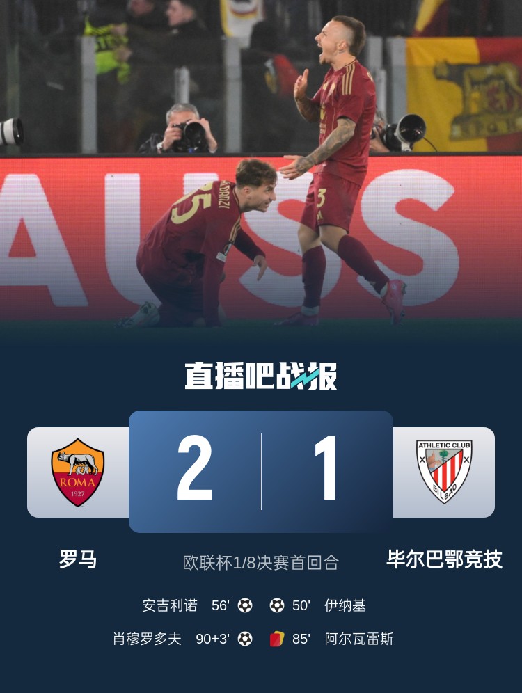 03月07日訊 歐聯杯1/8決賽首回合,羅馬主場2-1讀秒絕殺畢爾巴鄂競技,占得先機。