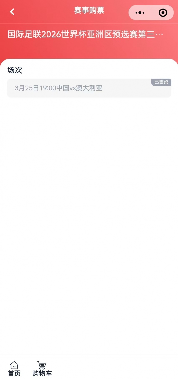3月7日訊 國足將于3月25日于世預賽18強戰主場迎戰澳大利亞,本場球票在今日17點開售,多個平臺迅速售罄。