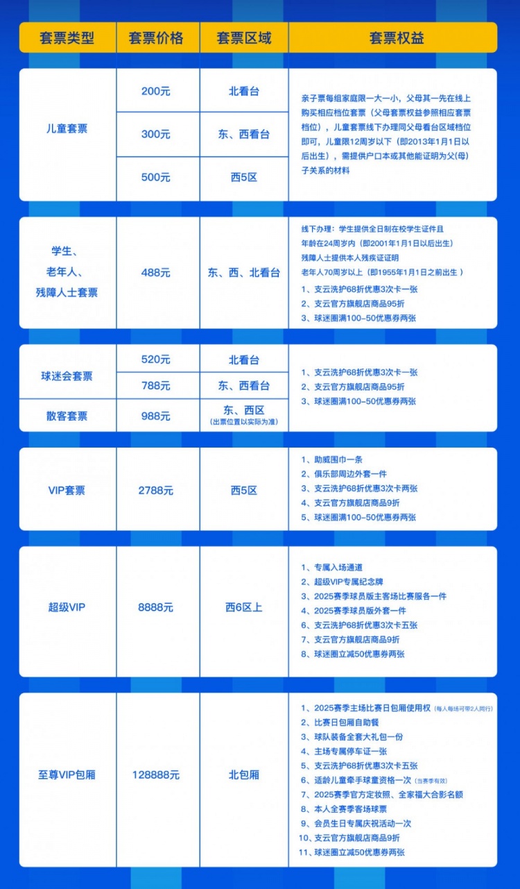 ?2、關于套票補辦:2025賽季全年主場套票,實體套票卡片僅可補辦一次,工本費100元。