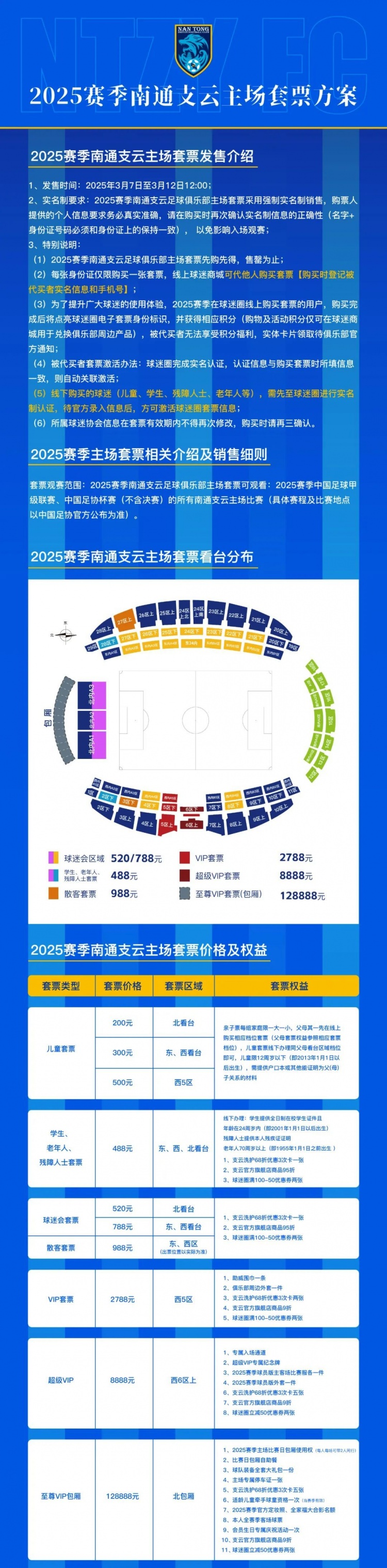 2、實名制要求:2025賽季南通支云足球俱樂部主場套票采用強制實名制銷售,購票人提供的個人信息要求務必真實準確,請在購買時再次確認實名制信息的正確性(名字+身份證號碼必須和身份證上的保持一致), 以免影響入場觀賽;
