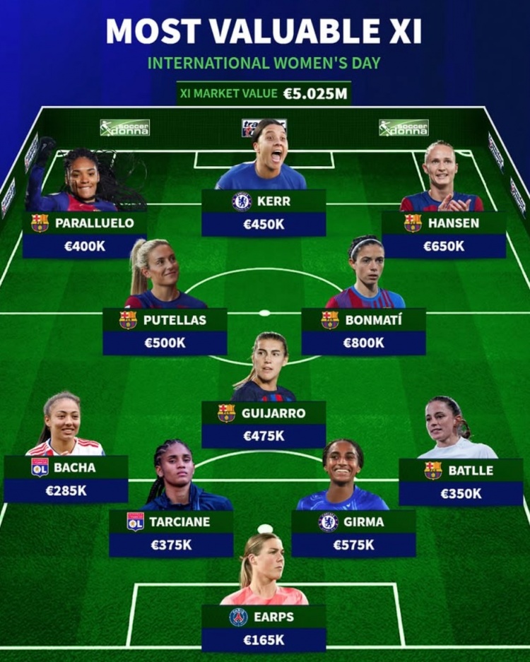 3月8日訊 時值國際婦女節,《轉會市場》也列出了當前女足身價最貴陣,巴塞羅那女足6將在列。