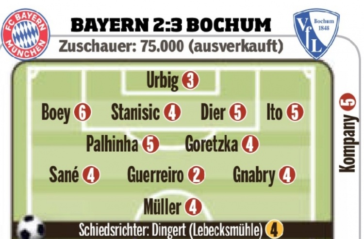 3月9日訊 拜仁在本輪德甲2-3被波鴻逆轉,《圖片報》在賽后按照慣例進行了評分,博伊被打出象征災難級的6分。