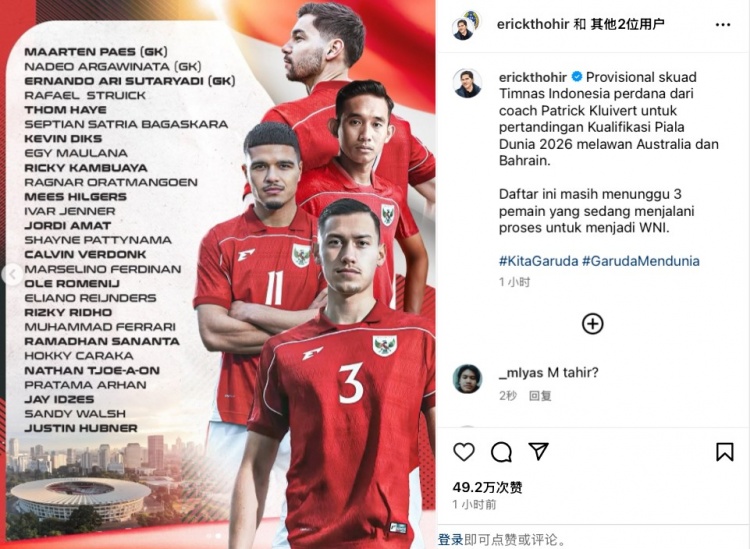 3月9日訊 今日,印尼足協(xié)主席托希爾更新社媒,曬出了印尼國家隊(duì)3月份18強(qiáng)賽大名單,迪克斯、伊澤斯、哈耶、帕斯、小賴因德斯、費(fèi)爾東克等歸化球員悉數(shù)入選。
