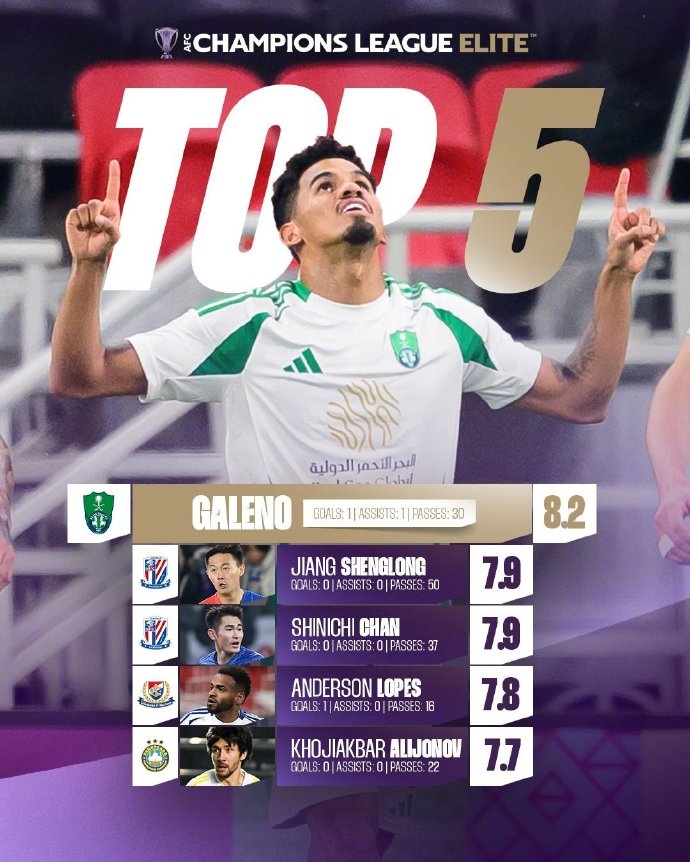 1、加萊諾(吉達國民)8.2分:1球1助攻30次傳球