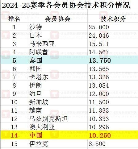 亞足聯在2月底即亞冠精英聯賽1/8決賽展開前,公布了亞足聯本賽季中期下屬各會員協會的技術積分排名,記者也曾撰文專門介紹過,中超聯賽以53.837分排名亞洲第七、東亞第三;泰國聯賽則以53.069分排名亞洲第八、東亞第四。就是說,截至前半賽季,中超僅僅領先泰超0.768分。