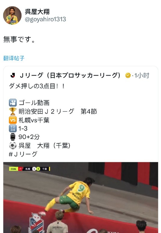 好在經過一番檢查,吳屋大翔并無大礙,并回到球場繼續(xù)比賽,比賽結束后,吳屋大翔也轉發(fā)了自己“出糗”視頻,并寫道“平安無事。”,再次讓球迷們安心。