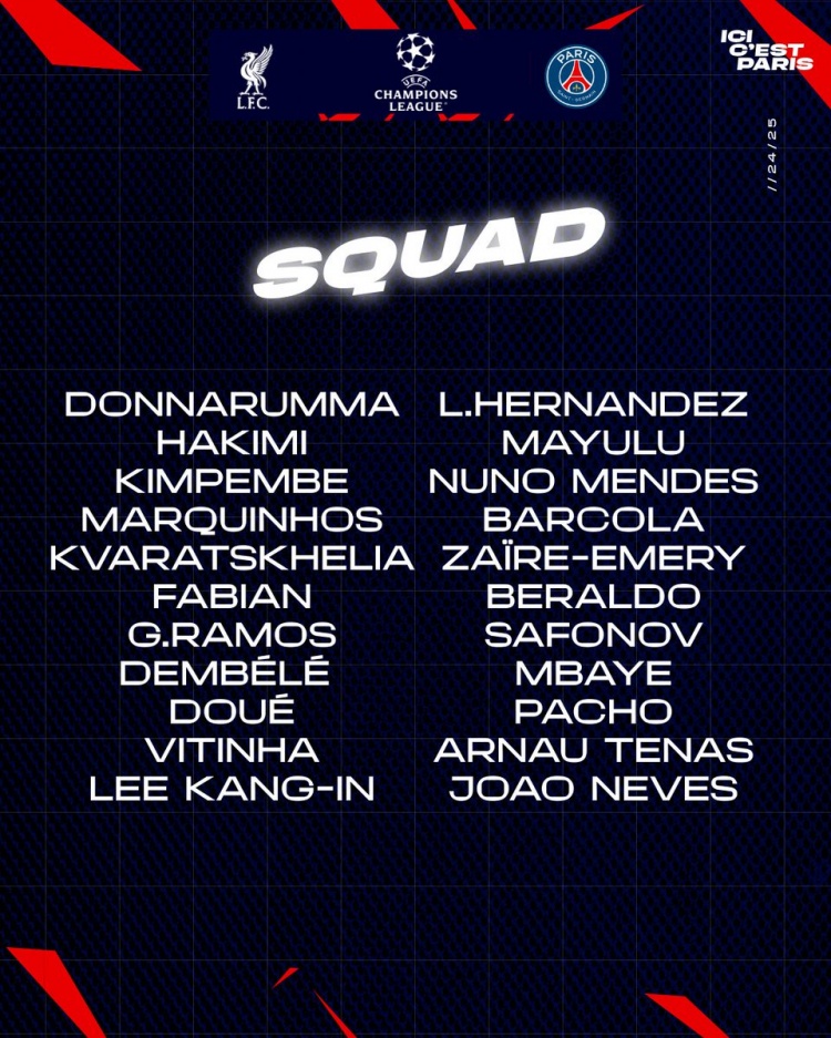 3月10日訊 北京時間3月12日凌晨4時,歐冠1/8決賽次回合利物浦主場對陣巴黎,雙方首回合利物浦1-0客場獲勝,巴黎今日公布此役大名單。
