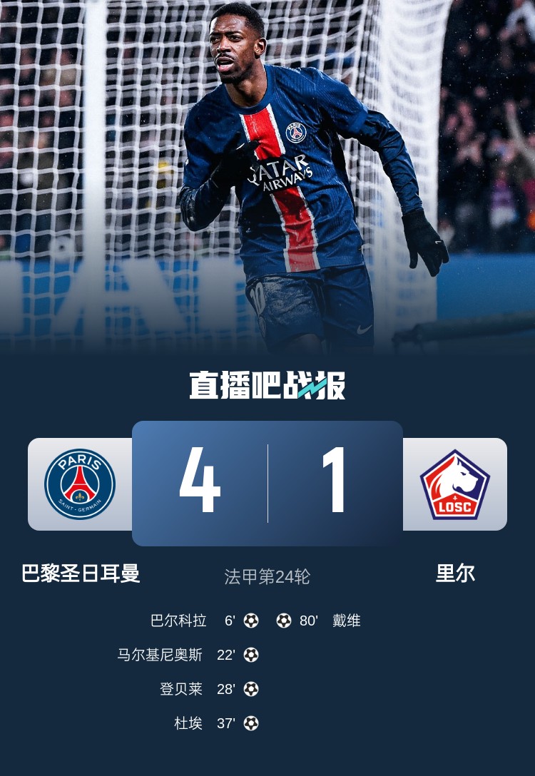 巴黎本輪4-1大勝里爾,此役后球隊10連勝,以16分優勢領跑。