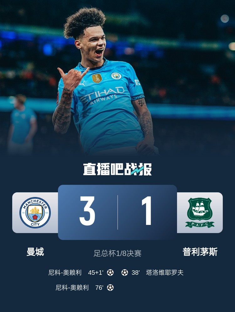 曼城足總杯3-1擊敗普利茅斯,奧賴利雙響建功,丁丁傳射。