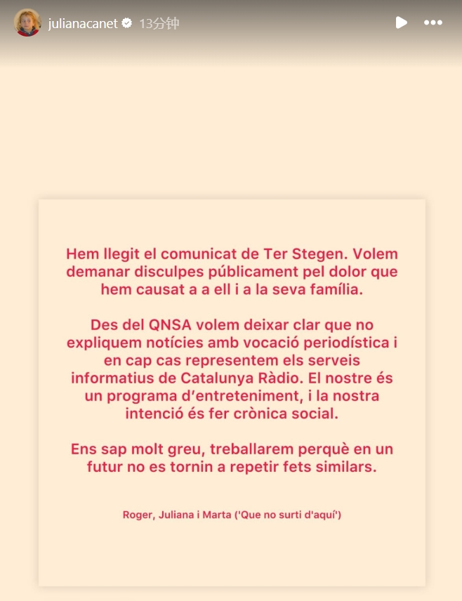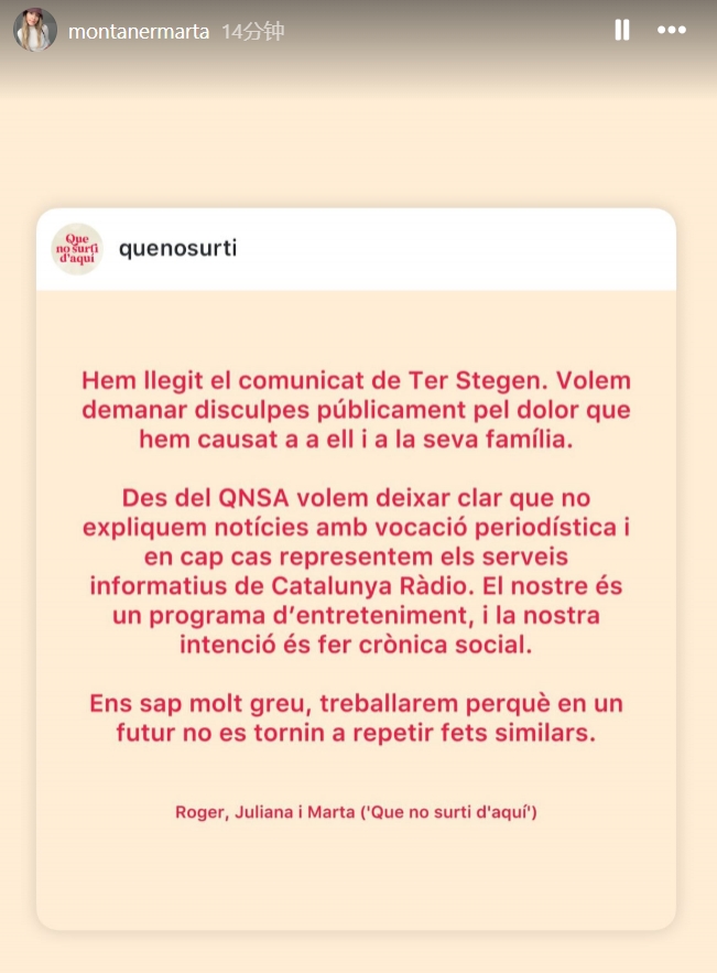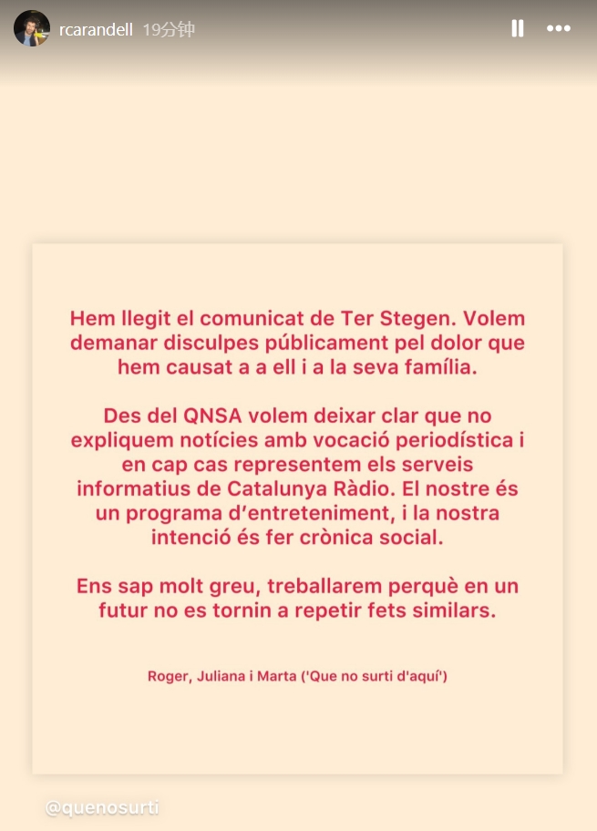 從節(jié)目《Que no surti d’aquí》的角度,我們想明確表示,我們并非以新聞視角報道事件,也不代表加泰羅尼亞廣播電臺的新聞服務(wù)。我們的節(jié)目是娛樂性質(zhì)的,我們的目的是進行社會紀(jì)實。
