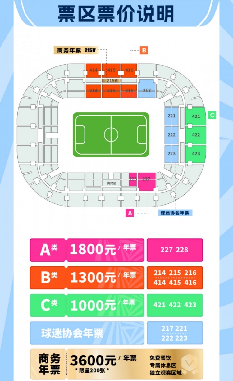 本次年票銷售,分為商務(wù)年票和看臺(tái)年票,其中商務(wù)年票的價(jià)格為3600元,限量200張;看臺(tái)年票共分為三檔,價(jià)格分別為1000元、1300元和1800元。