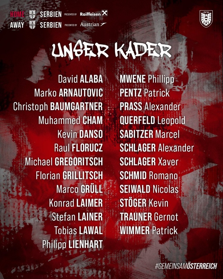3月11日訊 奧地利公布最新一期國家隊名單,阿拉巴領銜,阿瑙托維奇、薩比策、萊默爾、丹索在列。