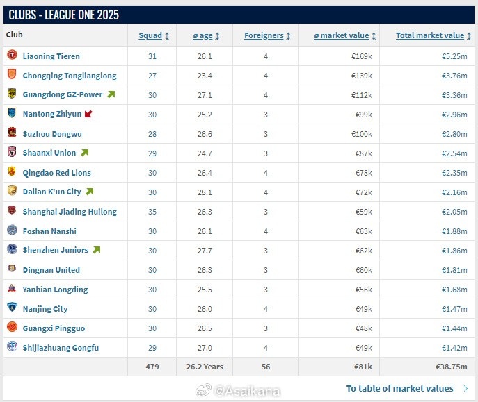 中甲聯賽各隊名單已在轉會市場更新。一線隊總身價最高的是遼寧鐵人,為525萬歐元,后面依次是重慶銅梁龍(376萬歐元)、廣東廣州豹(336萬歐元)、南通支云(296萬歐元)、蘇州東吳(280萬歐元)、陜西聯合(254萬歐元)、青島紅獅(235萬歐元)、大連鯤城(216萬歐元)、上海嘉定匯龍(205萬歐元)、佛山南獅(188萬歐元)、深圳青年人(186萬歐元)、定南贛聯(181萬歐元)、延邊龍鼎(168萬歐元)、南京城市(147萬歐元)、廣西平果(144萬歐元)、石家莊功夫(142萬歐元)。重慶銅梁龍是平均年齡最小的球隊,為23.4歲;大連鯤城平均年齡最大,為28.1歲。