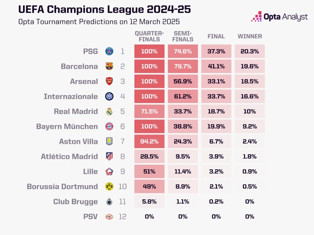03月12日訊 歐冠1/8決賽次回合先賽4場(chǎng),巴黎、巴薩、國(guó)米和拜仁晉級(jí),opta給出了最新的歐冠奪冠概率,其中淘汰此前opta最看好的利物浦而晉級(jí)的巴黎居首,巴薩第2,阿森納、國(guó)米、皇馬、拜仁緊隨其后。