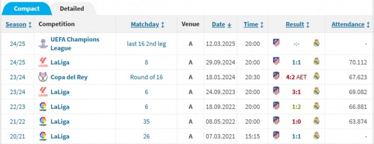 據德轉數據統計,皇馬近5年在各項賽事共計6次客戰馬競,僅獲1勝,戰績為1勝2平3負。