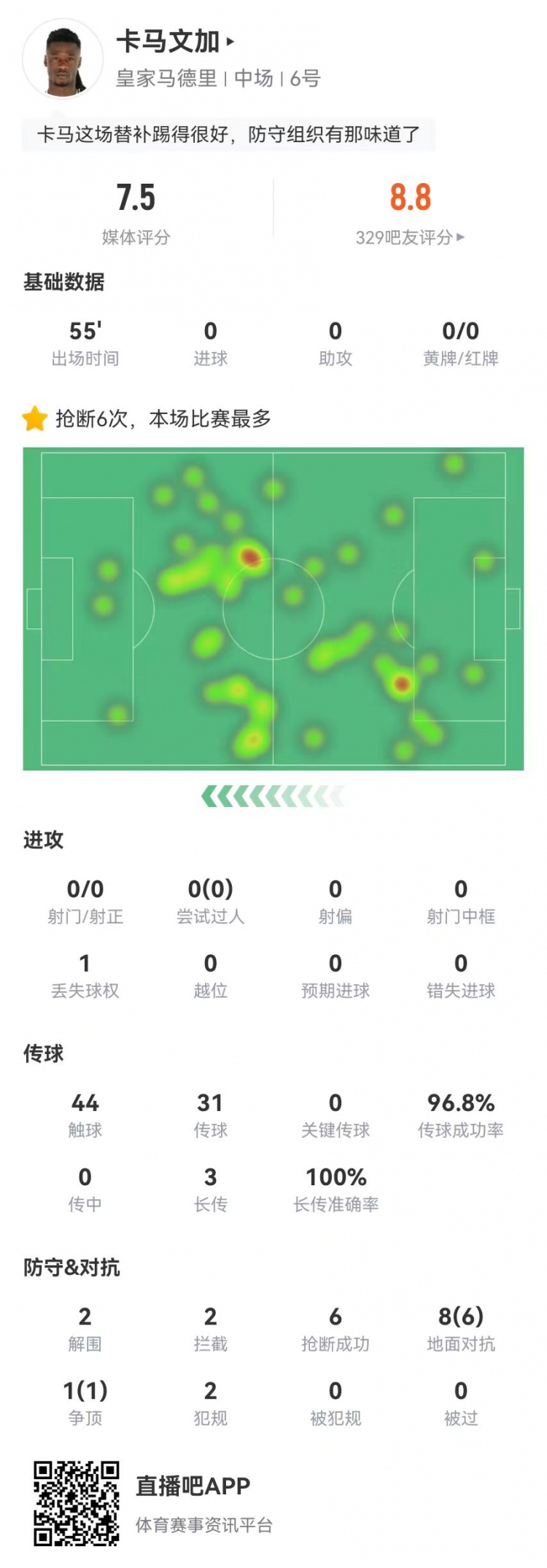 卡馬文加替補9對抗7成功+6搶斷2解圍2攔截 3長傳3成功 獲7.5分?