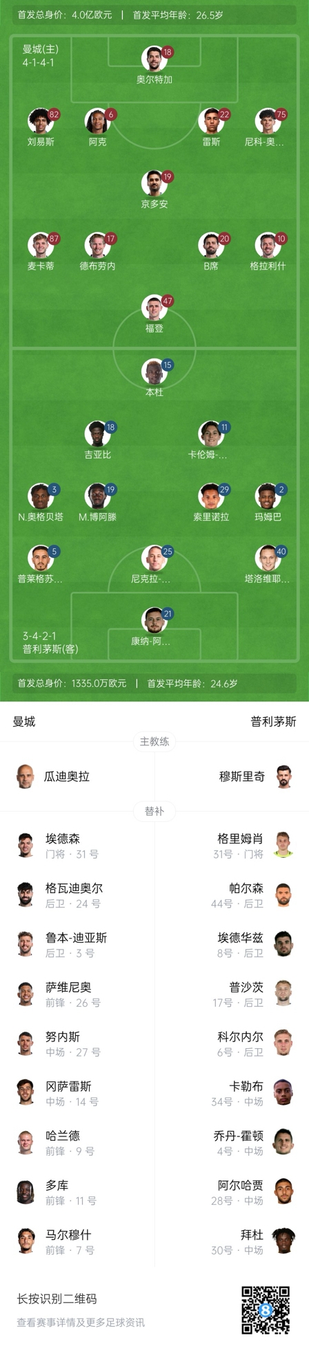 曼城首發(fā):18-奧爾特加、82-劉易斯、22-雷斯、6-阿克、75-奧賴?yán)?9-京多安、17-德布勞內(nèi)、87-麥卡蒂、20-B-席爾瓦、10-格拉利什、47-福登